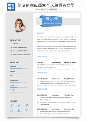 风云办公提供简洁创意应届生个人英文简历Word模板下载,格式为 docx,一共10页,作品中文字及图均可以修改和编辑,图片更改请在作品中右键图片并更换,文字修改请直接点击文字进行修改。更多精彩英文简历Word模板,尽在风云办公。