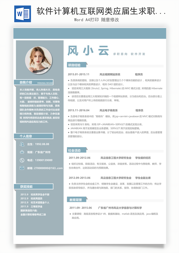 风云办公提供软件计算机互联网类应届生求职简历Word模板下载,格式为 docx,一共1页,作品中文字及图均可以修改和编辑,图片更改请在作品中右键图片并更换,文字修改请直接点击文字进行修改。更多精彩炫酷Word模板,尽在风云办公。