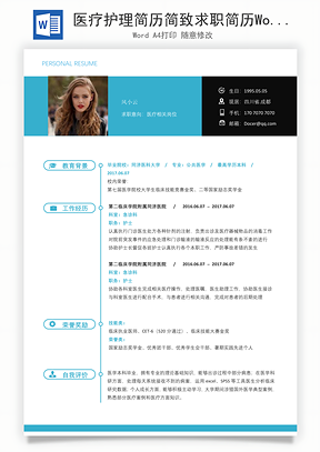 风云办公提供医疗护理简历简致求职简历Word模板下载,格式为 docx,一共1页,作品中文字及图均可以修改和编辑,图片更改请在作品中右键图片并更换,文字修改请直接点击文字进行修改。更多精彩炫酷Word模板,尽在风云办公。