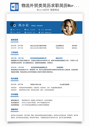 风云办公提供外贸物流简历求职简历Word模板下载,格式为 docx,一共1页,作品中文字及图均可以修改和编辑,图片更改请在作品中右键图片并更换,文字修改请直接点击文字进行修改。更多精彩其它简历Word模板,尽在风云办公。