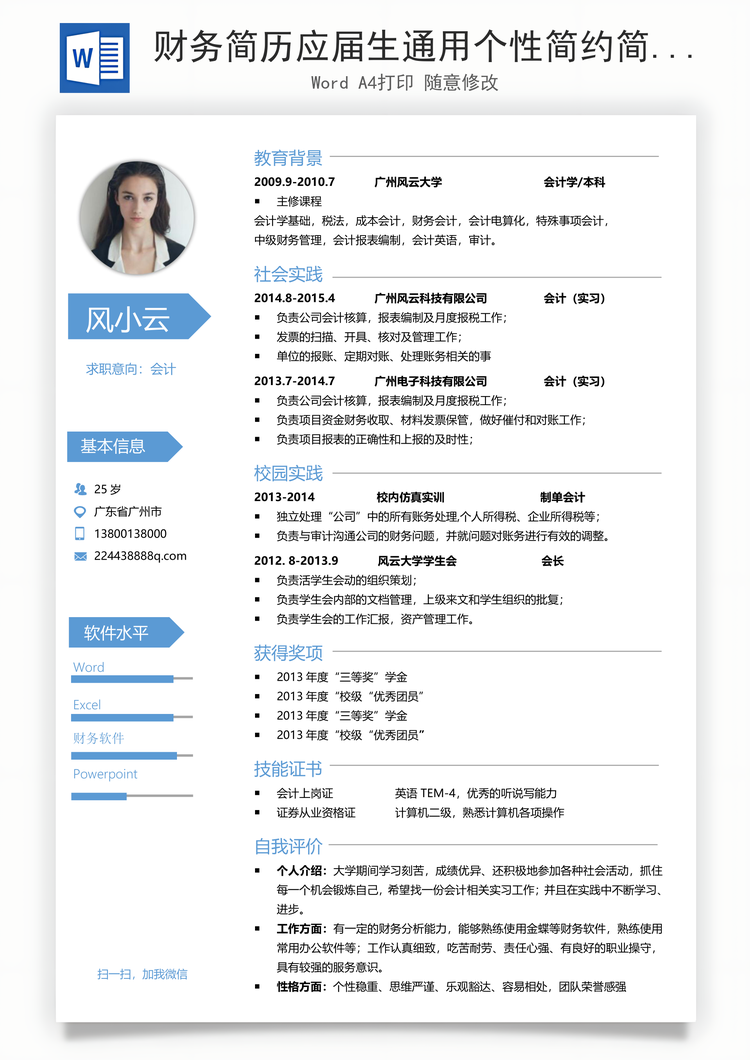 风云办公提供财务简历应届生通用个性简约简历Word模板下载,格式为 docx,一共1页,作品中文字及图均可以修改和编辑,图片更改请在作品中右键图片并更换,文字修改请直接点击文字进行修改。更多精彩其它简历Word模板,尽在风云办公。