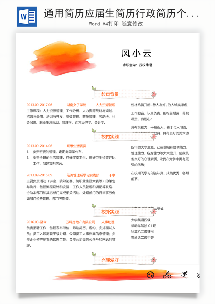 风云办公提供通用简历应届生简历行政简历个性简历创意简历Word模板下载,格式为 docx,一共1页,作品中文字及图均可以修改和编辑,图片更改请在作品中右键图片并更换,文字修改请直接点击文字进行修改。更多精彩应届生简历Word模板,尽在风云办公。