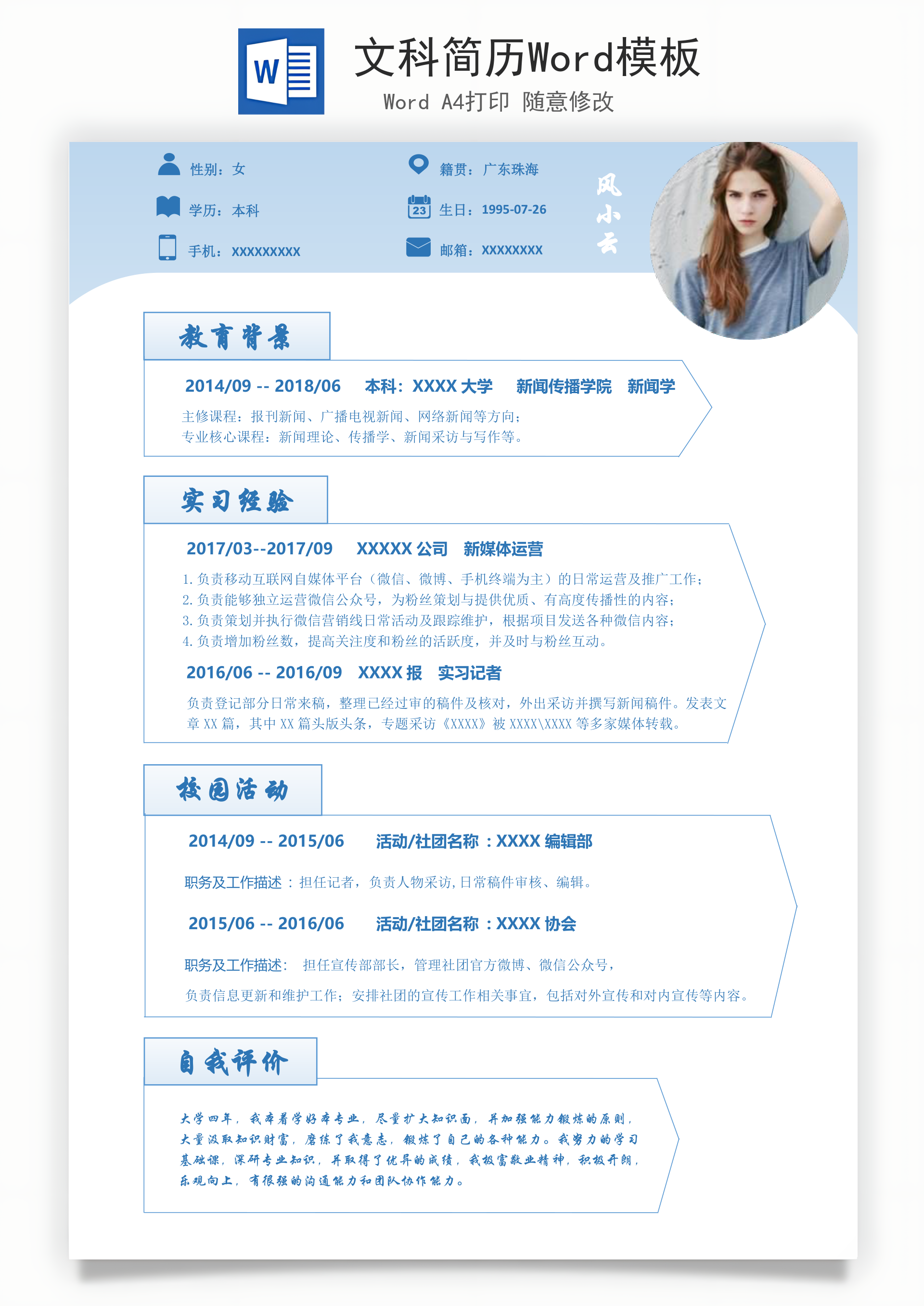 风云办公提供文科简历Word模板下载,格式为 docx,一共1页,作品中文字及图均可以修改和编辑,图片更改请在作品中右键图片并更换,文字修改请直接点击文字进行修改。更多精彩其它简历Word模板,尽在风云办公。