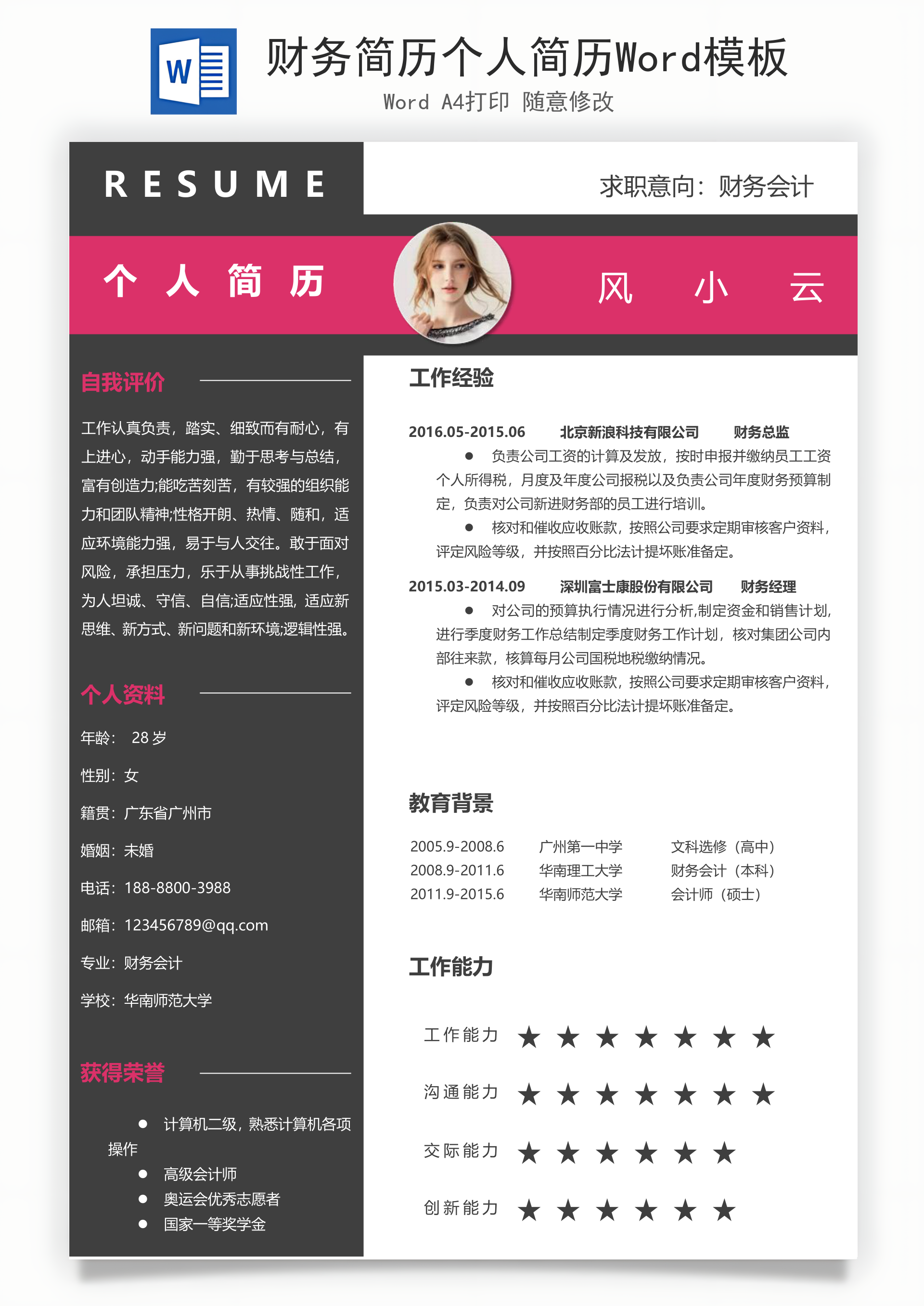 风云办公提供财务简历个人简历Word模板下载,格式为 docx,一共1页,作品中文字及图均可以修改和编辑,图片更改请在作品中右键图片并更换,文字修改请直接点击文字进行修改。更多精彩其它简历Word模板,尽在风云办公。