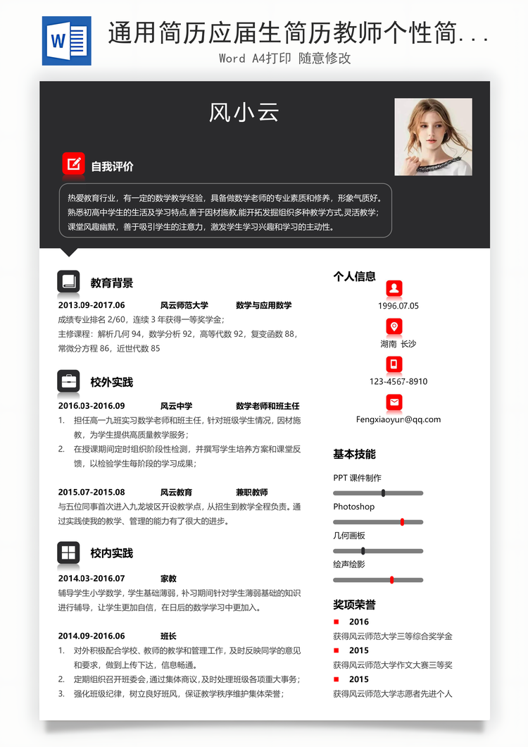 风云办公提供通用简历应届生简历教师个性简约简历Word模板下载,格式为 docx,一共1页,作品中文字及图均可以修改和编辑,图片更改请在作品中右键图片并更换,文字修改请直接点击文字进行修改。更多精彩应届生简历Word模板,尽在风云办公。