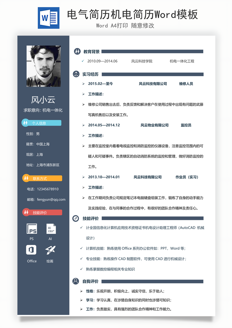 风云办公提供电气简历机电简历Word模板下载,格式为 doc,一共1页,作品中文字及图均可以修改和编辑,图片更改请在作品中右键图片并更换,文字修改请直接点击文字进行修改。更多精彩炫酷Word模板,尽在风云办公。
