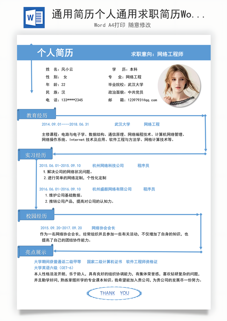 风云办公提供通用简历个人通用求职简历Word模板下载,格式为 docx,一共1页,作品中文字及图均可以修改和编辑,图片更改请在作品中右键图片并更换,文字修改请直接点击文字进行修改。更多精彩其它简历Word模板,尽在风云办公。