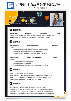 风云办公提供涉外翻译简历商务求职简历Word模板下载,格式为 docx,一共1页,作品中文字及图均可以修改和编辑,图片更改请在作品中右键图片并更换,文字修改请直接点击文字进行修改。更多精彩炫酷Word模板,尽在风云办公。