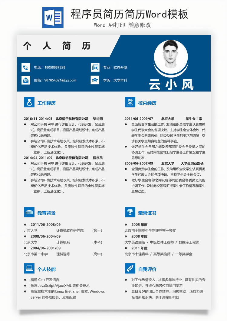 风云办公提供程序员简历简历Word模板下载,格式为 doc,一共1页,作品中文字及图均可以修改和编辑,图片更改请在作品中右键图片并更换,文字修改请直接点击文字进行修改。更多精彩其它简历Word模板,尽在风云办公。