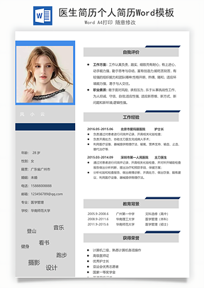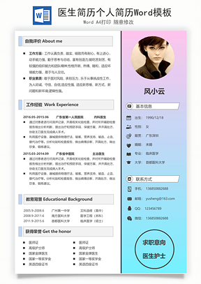 风云办公提供医生简历个人简历Word模板下载,格式为 docx,一共1页,作品中文字及图均可以修改和编辑,图片更改请在作品中右键图片并更换,文字修改请直接点击文字进行修改。更多精彩炫酷Word模板,尽在风云办公。