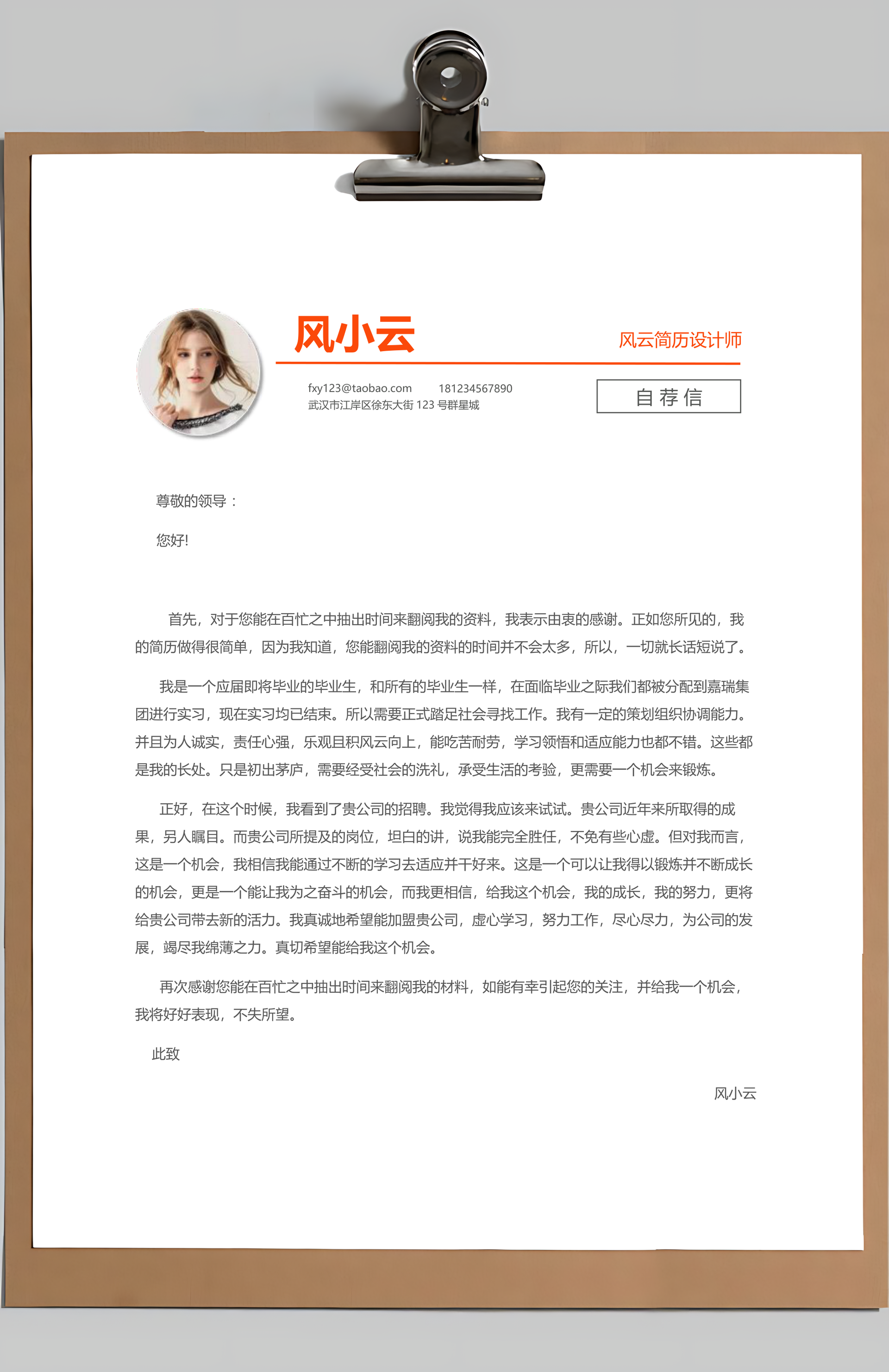 风云办公提供个性简历橘色系创意极简风格简历模板和自荐信Word模板下载,格式为 docx,一共1页,作品中文字及图均可以修改和编辑,图片更改请在作品中右键图片并更换,文字修改请直接点击文字进行修改。更多精彩其它简历Word模板,尽在风云办公。