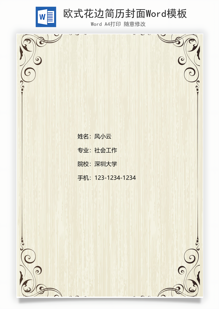 风云办公提供欧式花边简历封面Word模板下载,格式为 docx,一共1页,作品中文字及图均可以修改和编辑,图片更改请在作品中右键图片并更换,文字修改请直接点击文字进行修改。更多精彩简历封面Word模板,尽在风云办公。
