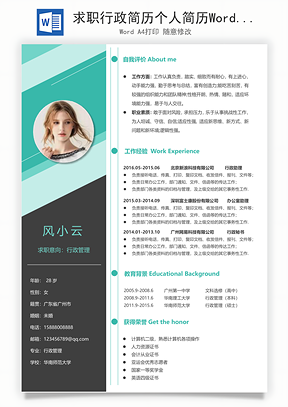 风云办公提供求职行政简历个人简历Word模板下载,格式为 docx,一共1页,作品中文字及图均可以修改和编辑,图片更改请在作品中右键图片并更换,文字修改请直接点击文字进行修改。更多精彩其它简历Word模板,尽在风云办公。