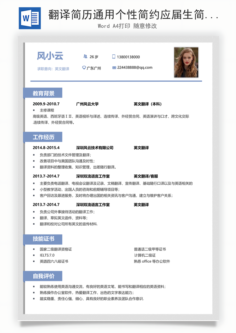风云办公提供翻译简历通用个性简约应届生简历Word模板下载,格式为 docx,一共1页,作品中文字及图均可以修改和编辑,图片更改请在作品中右键图片并更换,文字修改请直接点击文字进行修改。更多精彩应届生简历Word模板,尽在风云办公。