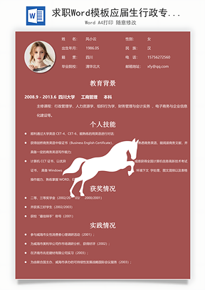 风云办公提供简历求职行政人事简历行政专员人事前台简历最新Word模板下载,格式为 docx,一共1页,作品中文字及图均可以修改和编辑,图片更改请在作品中右键图片并更换,文字修改请直接点击文字进行修改。更多精彩其它简历Word模板,尽在风云办公。