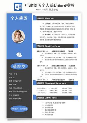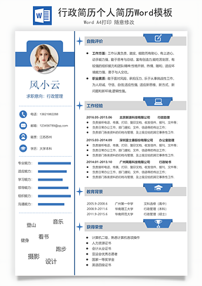 风云办公提供行政简历个人简历Word模板下载,格式为 docx,一共1页,作品中文字及图均可以修改和编辑,图片更改请在作品中右键图片并更换,文字修改请直接点击文字进行修改。更多精彩其它简历Word模板,尽在风云办公。