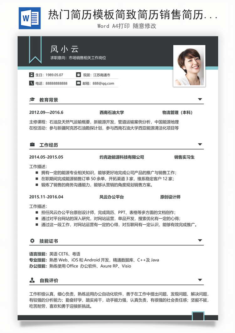 风云办公提供热门简历模板简致简历销售简历求职简历热门应届简历热门简历Word模板下载,格式为 docx,一共1页,作品中文字及图均可以修改和编辑,图片更改请在作品中右键图片并更换,文字修改请直接点击文字进行修改。更多精彩其它简历Word模板,尽在风云办公。