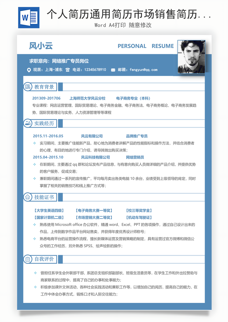 风云办公提供个人简历通用简历市场销售简历应届毕业生求职简历Word模板下载,格式为 docx,一共1页,作品中文字及图均可以修改和编辑,图片更改请在作品中右键图片并更换,文字修改请直接点击文字进行修改。更多精彩其它简历Word模板,尽在风云办公。