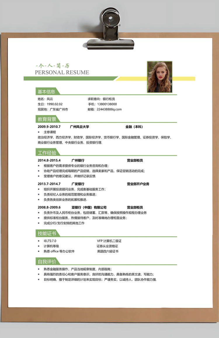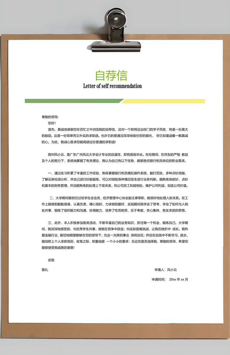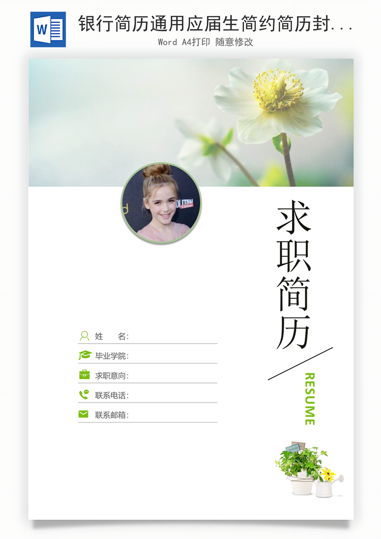 风云办公提供银行简历通用应届生简约简历封面Word模板下载,格式为 docx,一共2页,作品中文字及图均可以修改和编辑,图片更改请在作品中右键图片并更换,文字修改请直接点击文字进行修改。更多精彩简历封面Word模板,尽在风云办公。