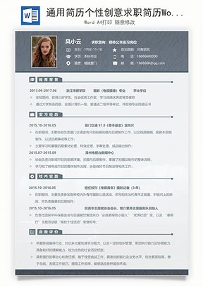 风云办公提供通用简历个性创意求职简历Word模板下载,格式为 docx,一共1页,作品中文字及图均可以修改和编辑,图片更改请在作品中右键图片并更换,文字修改请直接点击文字进行修改。更多精彩炫酷Word模板,尽在风云办公。